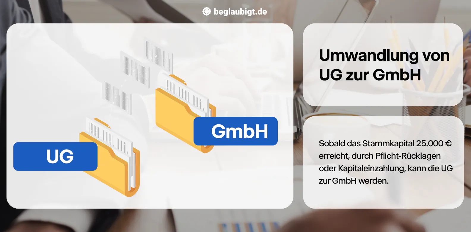 - Umwandlung: Eine UG kann zur GmbH werden, wenn Rücklagen aufgebaut sind