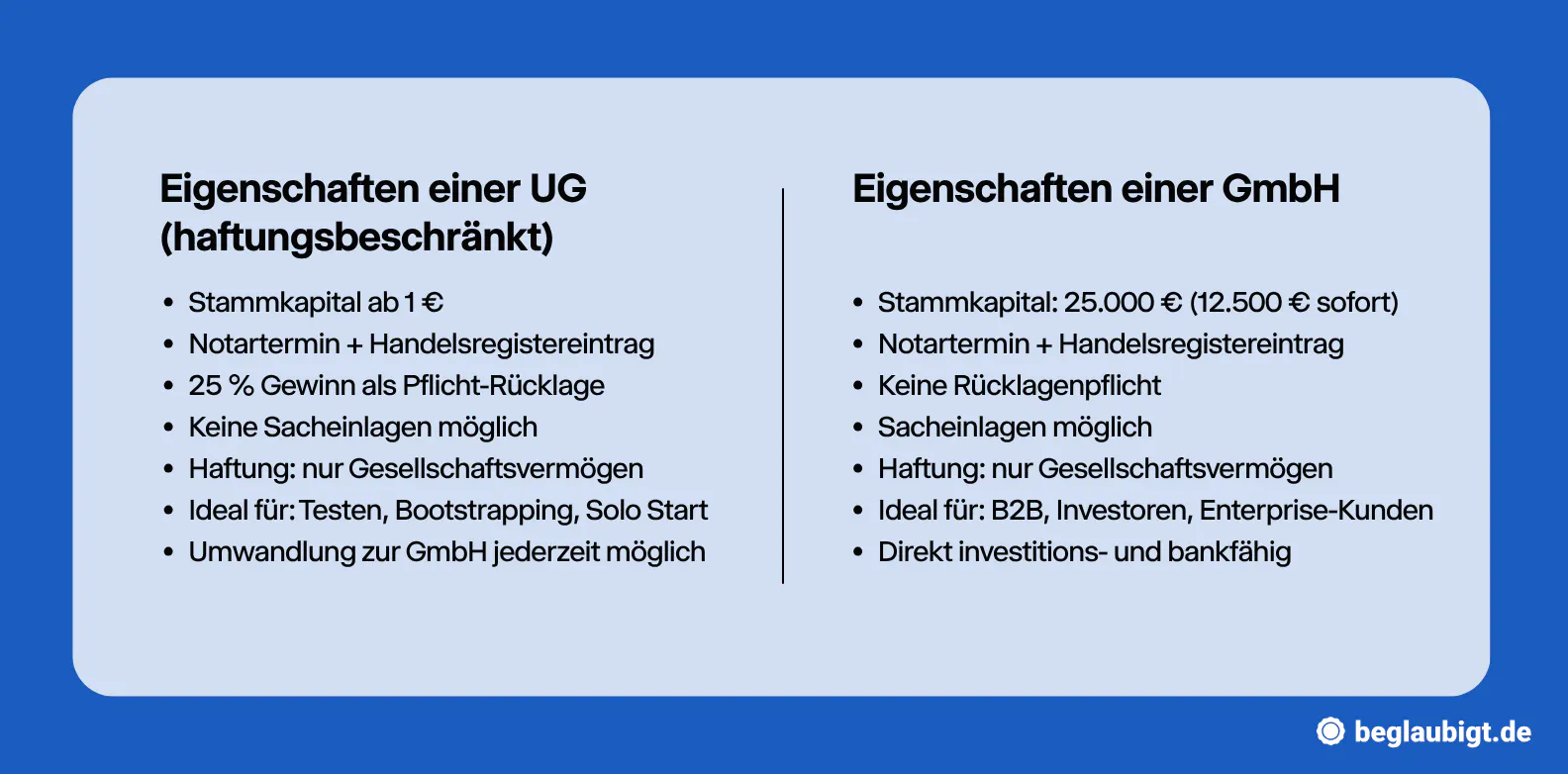 Was sie trennt: Wie viel Kapital du aufbringen musst, wie Gläubiger auf dich reagieren und wie viel von deinem Gewinn du wirklich ausschütten darfst. Wer tiefer in die Voraussetzungen einsteigen will, findet die vollständige Übersicht in unserem Artikel zu den Voraussetzungen.