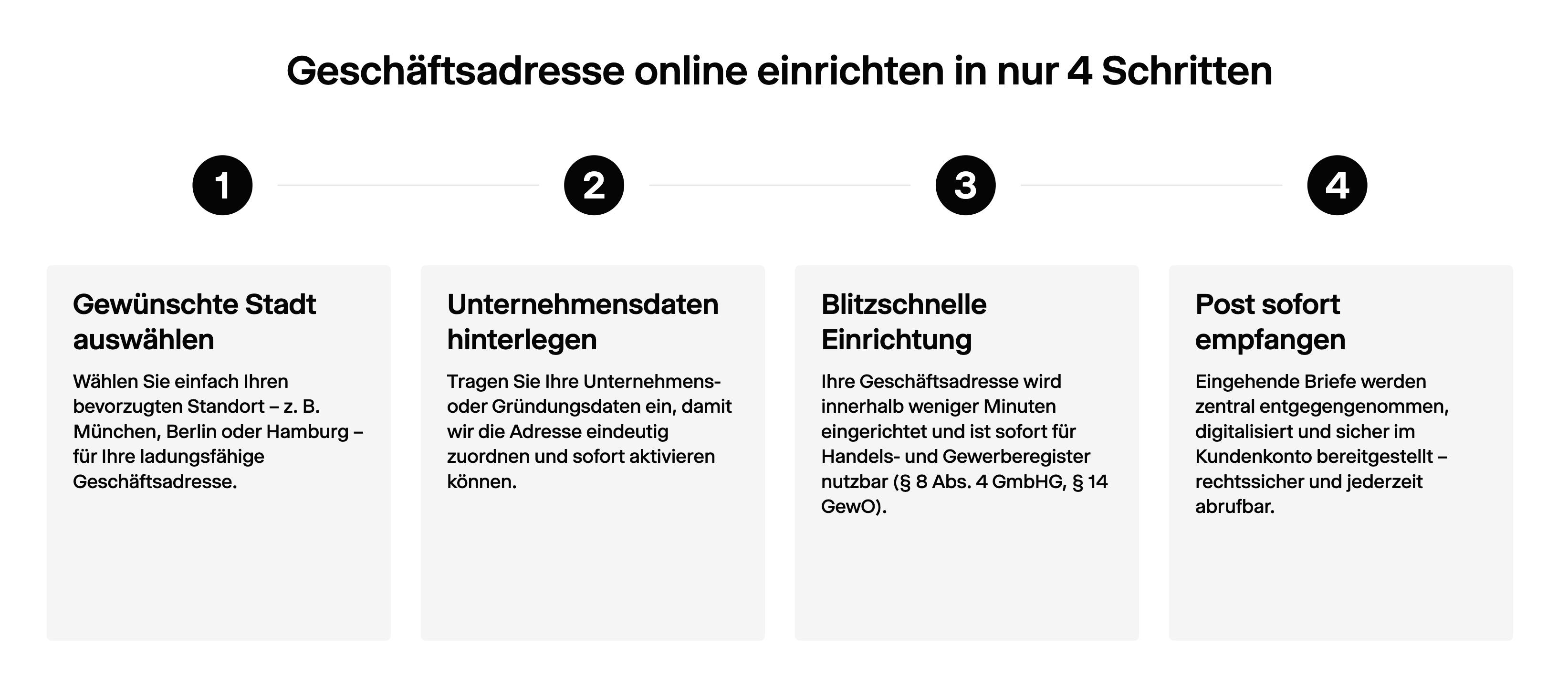 Mit einer Geschäftsadresse von beglaubigt.de erfüllen Sie alle gesetzlichen Anforderungen an eine ladungsfähige Anschrift nach § 8 Abs. 4 GmbHG und § 14 GewO.