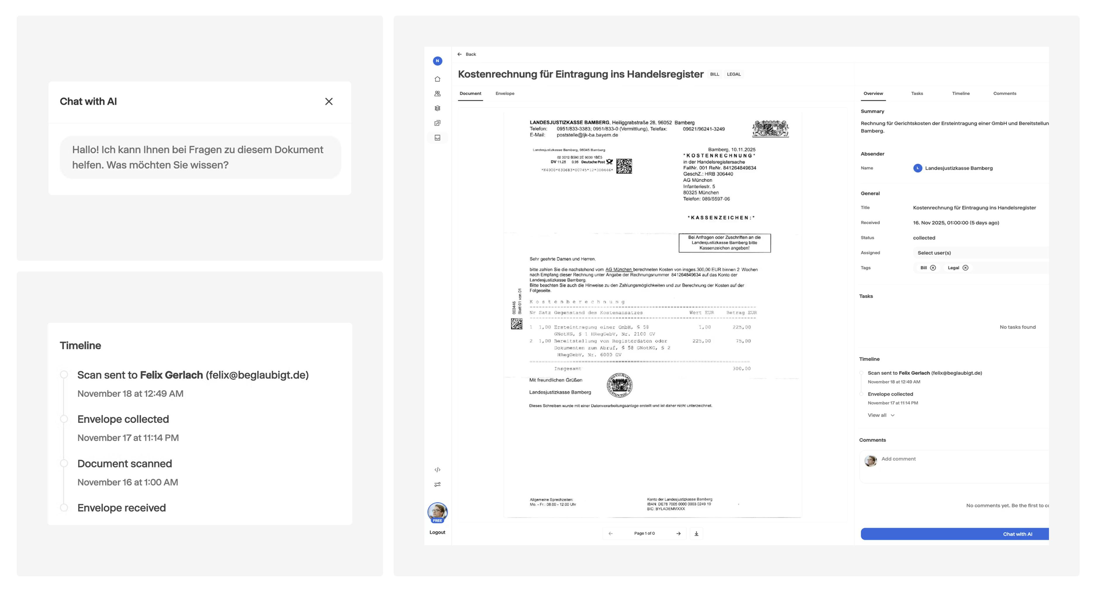 Unsere KI erläutert, worum es im jeweiligen Schreiben geht – besonders hilfreich bei Finanzamt- und Registerpost. - Automatische Mitarbeiter-Zuweisung