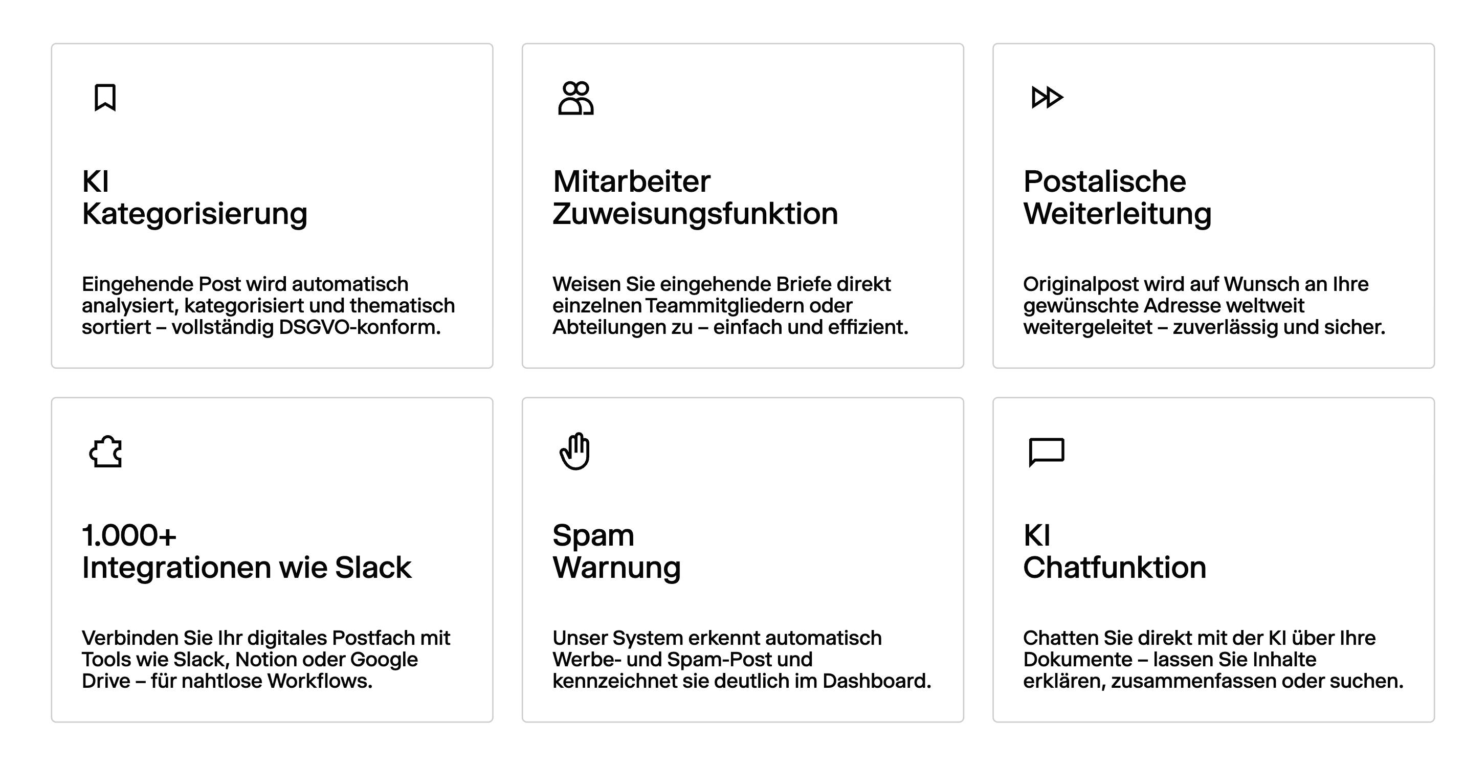 - ein modernes, digitales Postfach, das alle eingehenden Briefe automatisiert verarbeitet, kategorisiert und bereitstellt