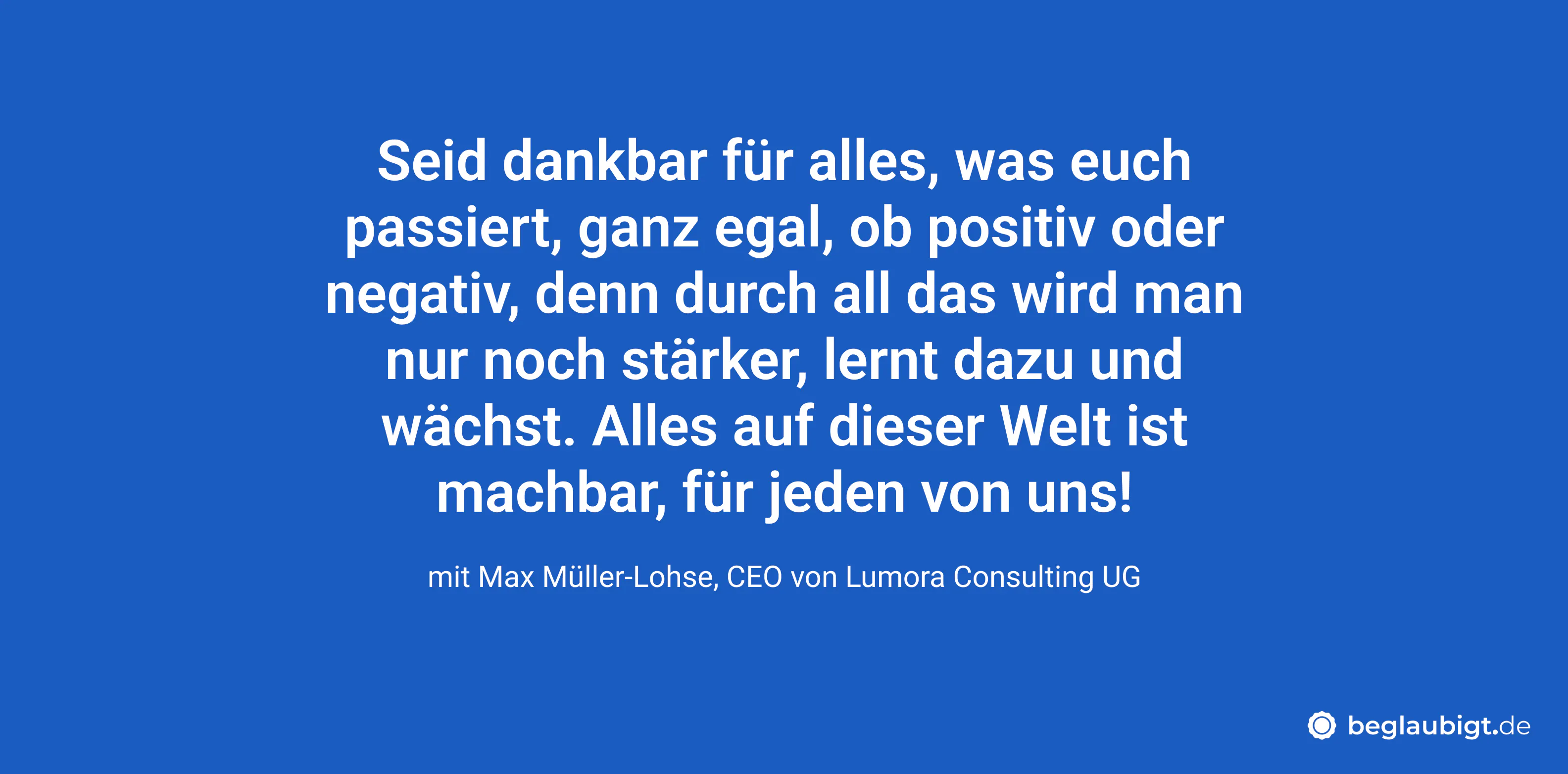 – „Seid dankbar für alles, was euch passiert, ganz egal, ob positiv oder negativ, denn durch all das wird man nur noch stärker, lernt dazu und wächst. Alles auf dieser Welt ist machbar, für jeden von uns!“ – Max Müller-Lohse