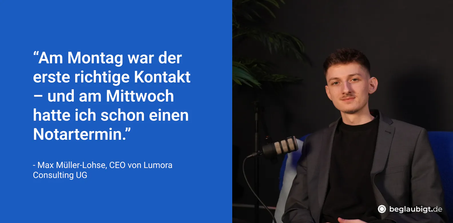 — „Am Montag war der erste richtige Kontakt – und am Mittwoch hatte ich schon einen Notartermin. Das war wirklich mit das Beste, weil die Notare, die ich so angeschrieben habe, da hätte ich sechs bis acht Wochen warten müssen." – Max Müller-Lohse